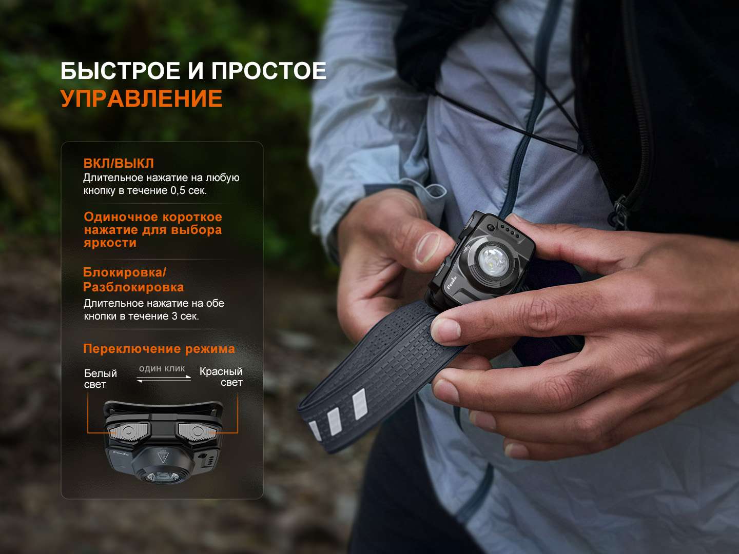 Fenix HL12R V2.0 — легкий и удобный налобный фонарь, который отлично подойдет для тренировок на открытом воздухе, бега, походов, кемпинга, рыбалки и охоты. Также пригодится для повседневного использования и ремонта. Регулируемый угол наклона позволяет точно настроить луч света, а легкий вес 72.5 г не утяжелит вашу экипировку и сделает тренировки и путешествия более комфортными.