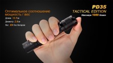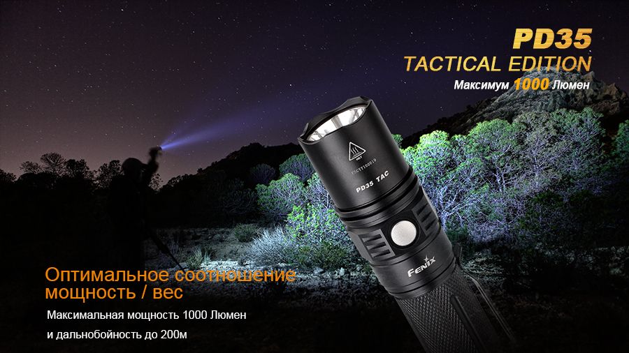 Краткое описание Фонарь Fenix PD35 TAC сочетает все необходимые качества тактического, охотничьего, туристического и бытового фонаря. В нем использованы самые современные технологии и только качественные материалы. Благодаря этому, фонарь светит с яркостью 1000 люмен, работает в шести режимах освещения, выдерживает высокие механические нагрузки и может использоваться при любой погоде.