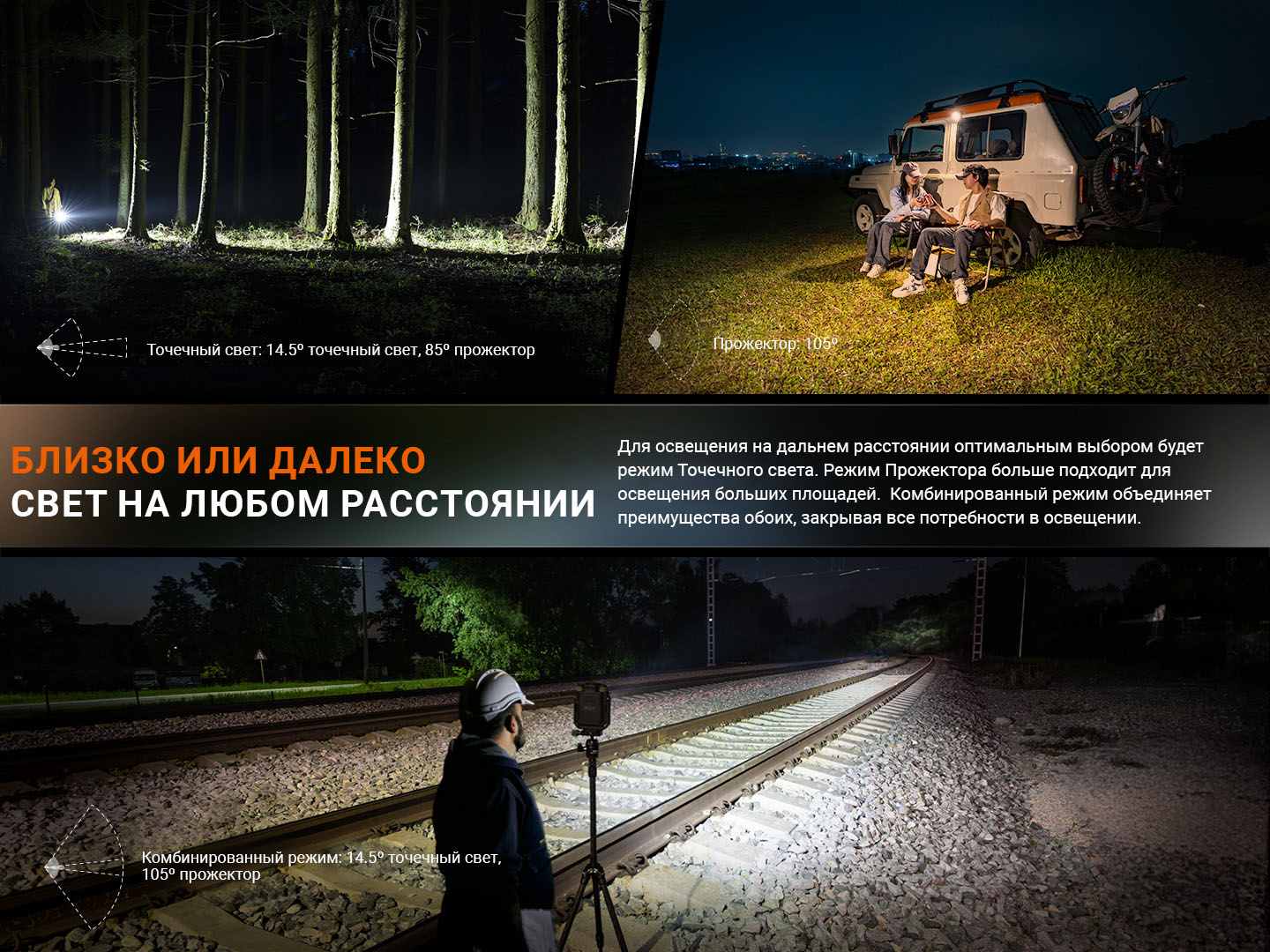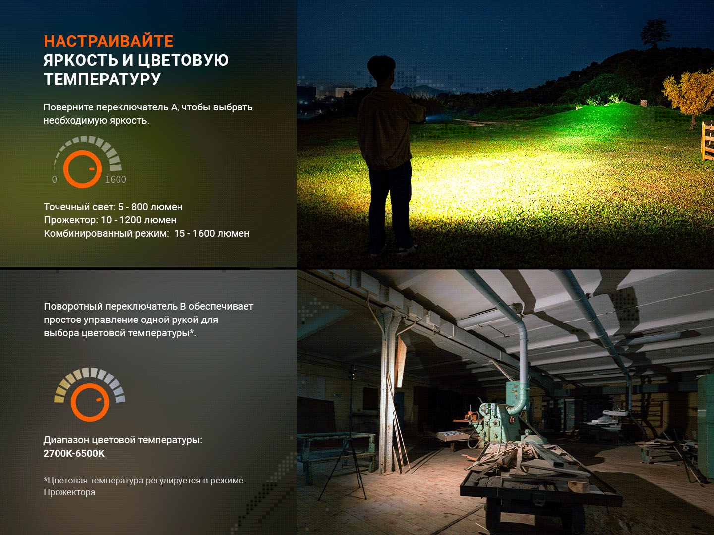 10 режимов освещения: 3 рассеянных, 3 направленных, 2 комбинированных и 2 красных для разных сценариев использования.
