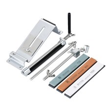 Модель Ruixin — это один из клонов на известную точилку Edge Pro. Она полностью выполнена из металла, хотя и не из нержавейки, а из никелированного железа. Основание точилки можно прикрутить к столешнице болтами или же просто поставить на стол и придерживать во время работы рукой. Точильный станок собирается из нескольких деталей, поэтому в разобранном виде он очень компактный и удобный для транспортировки. В комплект входит сразу четыре точильных камня, каждый из которых закреплен на пластиковой подложке. Из можно достаточно быстро закрепить на направляющей и поочередно менять для достижения наилучшего результата. Зернистость этих камней составляет 120, 320, 600 и 1500 грит. Производители рекомендуют затачивать лезвие плавными движениями «от себя», не надавливая на клинок до появления заусенца. Помимо ножей, с помощью Ruixin можно заточить ножницы, строительные или сельскохозяйственные инструменты, а также другие предметы, нуждающиеся в подобном уходе. Угол заточки каждый пользователь может выбрать самостоятельно, благодаря чему удается качественно заточить ножи разного назначения: толстые охотничьи, туристические или наиболее тонкие филейные. Весит точилка Ruixin 845 грамм.