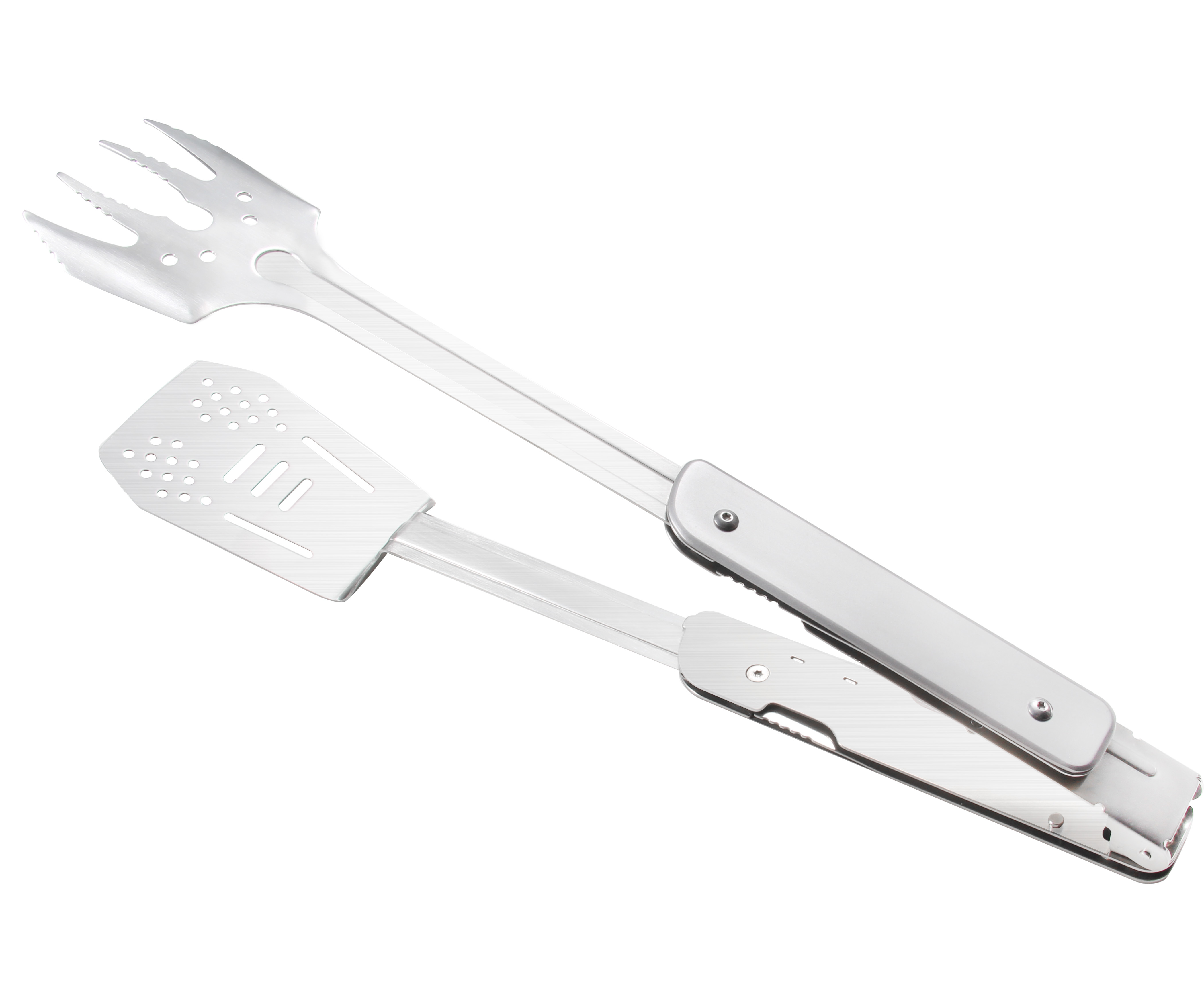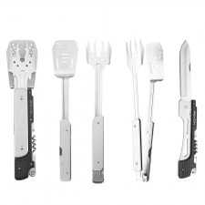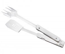 Непосредственно к ножу крепятся лопатка и вилка. Оба инструмента сделаны полностью металлическими, со складной ручкой. У вилки 4 зубчика с зазубринами, чтобы мясо не соскальзывало с нее. Есть отверстия для стекания жира. Такие же отверстия сделаны и на лопатке. Вилку с лопаткой можно соединить таким образом, чтобы они играли роль щипцов.